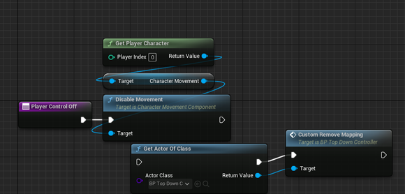 Probably with the Disable Movement node, (Target is Character Movement Component,) I had a similar issue, as there isn’t an Enable Movement node. Or at least not that I can find. I just used the Disable Input node instead, as there is an Enable Input nod