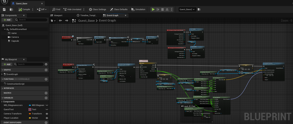 - 퀘스트 NPC 클릭 시 시점변환 및 클릭시 다음으로 넘어가기 완료 → 카메라와 캐릭터, NPC mesh와 위치는 실제 프로젝트 맵에서 적용한 뒤 세부 조정할 것 (노드 연결 뒤 값만 조정하면 됨)
